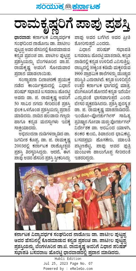 by: Navakarnataka PublicationsPosted on: July 25, 2023July 31, 2023ಡಾ|| ಜಿ. ರಾಮಕೃಷ್ಣ ಅವರಿಗೆ ಪಾಪು ಪ್ರಶಸ್ತಿ